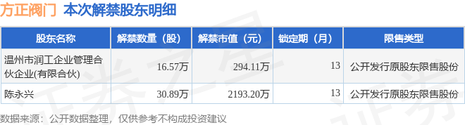 证券之星消息,根据市场公开信息整理,方正阀门(920082)于2月6日将有47.46万股限售股份解禁,为公司公开发行原股东限售股份,占公司总股本0.33%。(本次数据根据历史公告整理得出,实际情况以上市公司最新公告为准)最近一年内,该股累计解禁745.74万股,占总股本的5.13%。本次解禁后,公司还有1.06亿股限售股份,占总股本72.78%。具体如下图所示: